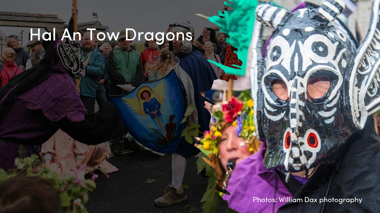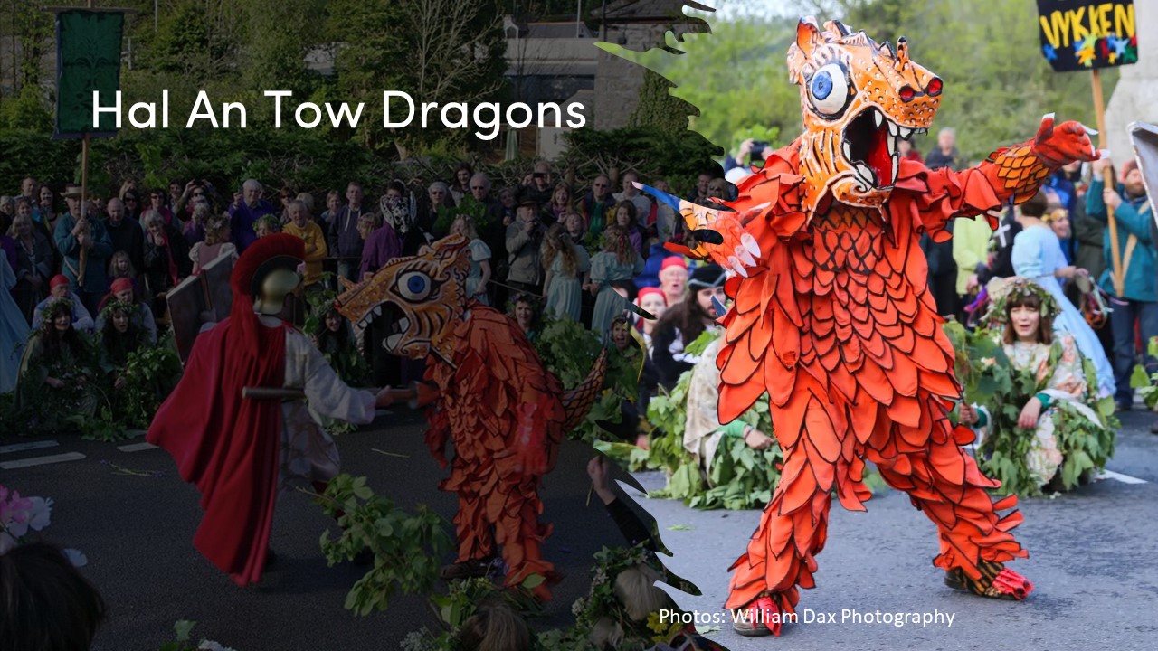 [12] The Hal An Tow takes place 7 times at various points in Helston on Flora Day, the action includes three saints defeating dragons see Andy Norfolk, Folklore of the Hal An Tow, Ed. Alex Langstone, Lien Gwerin – Journal of Cornsih Folklore no.7, Spirit of Albion Books, 2023, pp 4 -24.